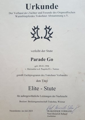 Neumünster, Juli 2025: Trakehner Verband Auszeichnung Parade Go, topfit, mit fast 28 Jahren erhält sie vom Trakehner Verband die Auszeichnung Elite Stute. Ihre Tochter Pr. St. Primavera MK wird in der Leistung folgen und erwartet Ende Mai 2026 ein Fohlen von TSF Gaspard ND. |